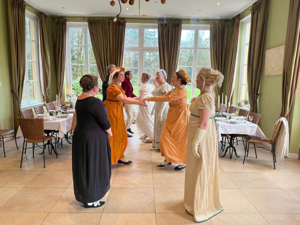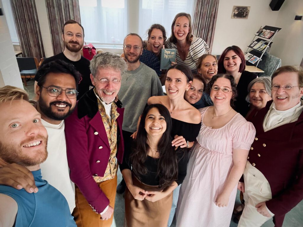 Geen TMS “optreden” deze keer, maar historische “coaching” geven aan anderen! Voor een Eindhovense productie van Jane Austen’s Pride & Prejudice hebben een aantal TMS leden de cast meegenomen in een dag-lang Regency “deep-dive”.  Correcte etiquette, lichamelijk houdingen, het dansen… het kwam allemaal aan bod om de acteurs te helpen om een overtuigend authentiek tijdsbeeld neer te zetten. De drie voorstellingen half december waren allemaal uitverkocht, en waren zo’n grote succes dat er plannen zijn om de productie te herhalen in december 2026.