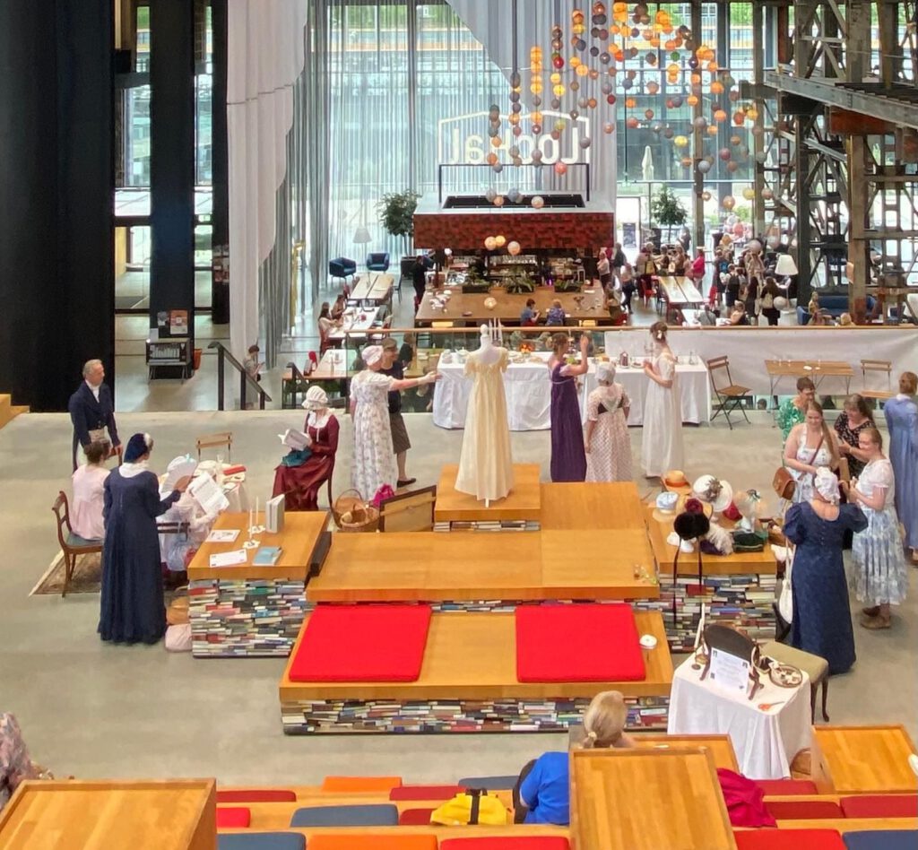 Jane Austen 250 was een dag-evenement in Tilburg ter ere van de 250e verjaardag van onze geliefde schrijfster. Het evenement vulde de hele LocHal met mensen die kwamen genieten van een grote Austen Markt, een Regency Modeshow, een dans demonstraties waar men aan kon meedoen en een uitgebreide programma van lezingen + workshops. TMS heeft twee onderdelen van het programma verzorgd: een lezing over De Mannen van Jane Austen en een lezing/workshop over correspondentie in de Regency tijd. Ook hebben we een mooie theesalon-tafereel opgezet met daarnaast een “Kleed je als Austen” boudoir. Hier konden bezoekers zich als Regency dame laten aankleden en wat liep dat storm!
