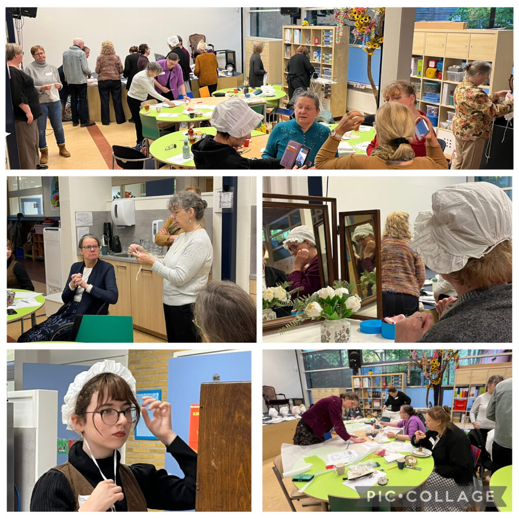 Een echte Regency dame draagt een cap in haar huis…maar vaak voelen we ons dan een dienstmeisje! Een van onze leden gaf een presentatie en vertelde waarom een cap echt bij het Regency tijdsbeeld hoort en deelde vele afbeeldingen van de meest prachtige caps van linnen, kant, organza en katoen. Verschillende dames hadden hun cap meegenomen zodat de ruim 25 deelnemers voor de spiegel konden passen en ervaren hoe ze de cap vonden staan. Na een heerlijke potluck lunch ging iedereen aan de slag: er werden patronen uitgewisseld en de eerste steken gemaakt voor een nieuwe cap!